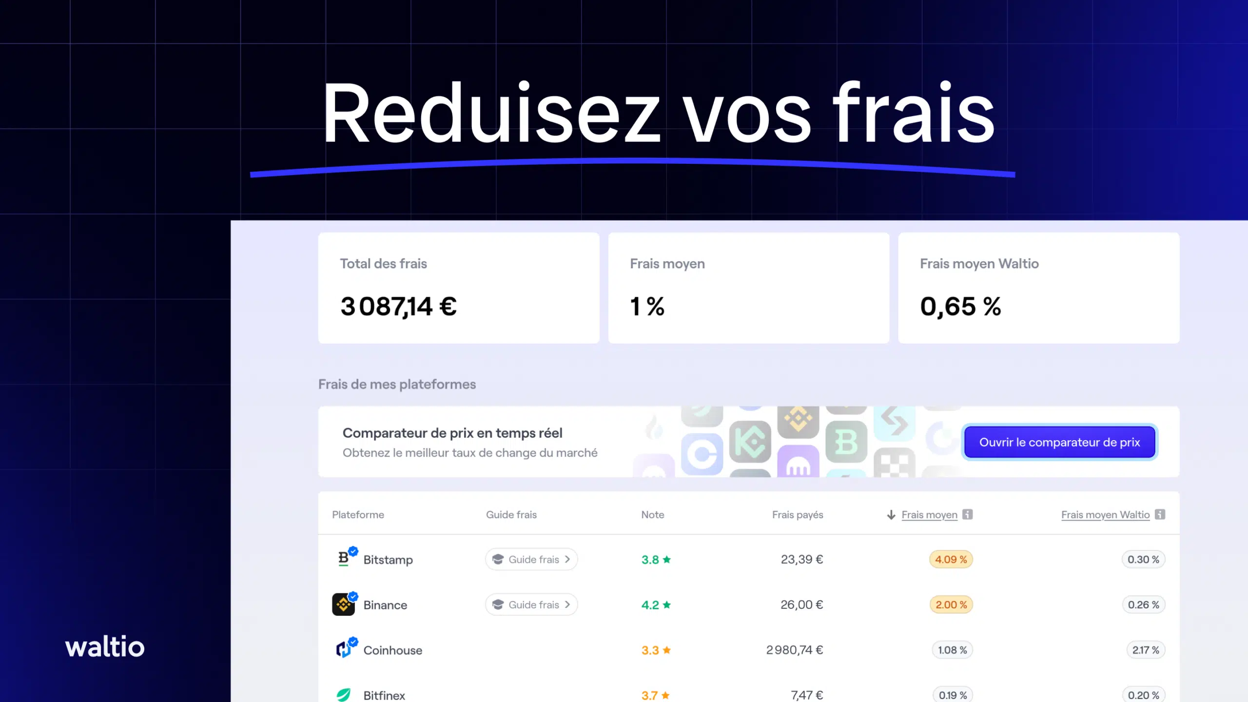 - Comparaison avec la Communauté : Comparez votre taux moyen de frais avec celui des autres utilisateurs de Waltio. Cette transparence vous aide à identifier les opportunités d’économies.