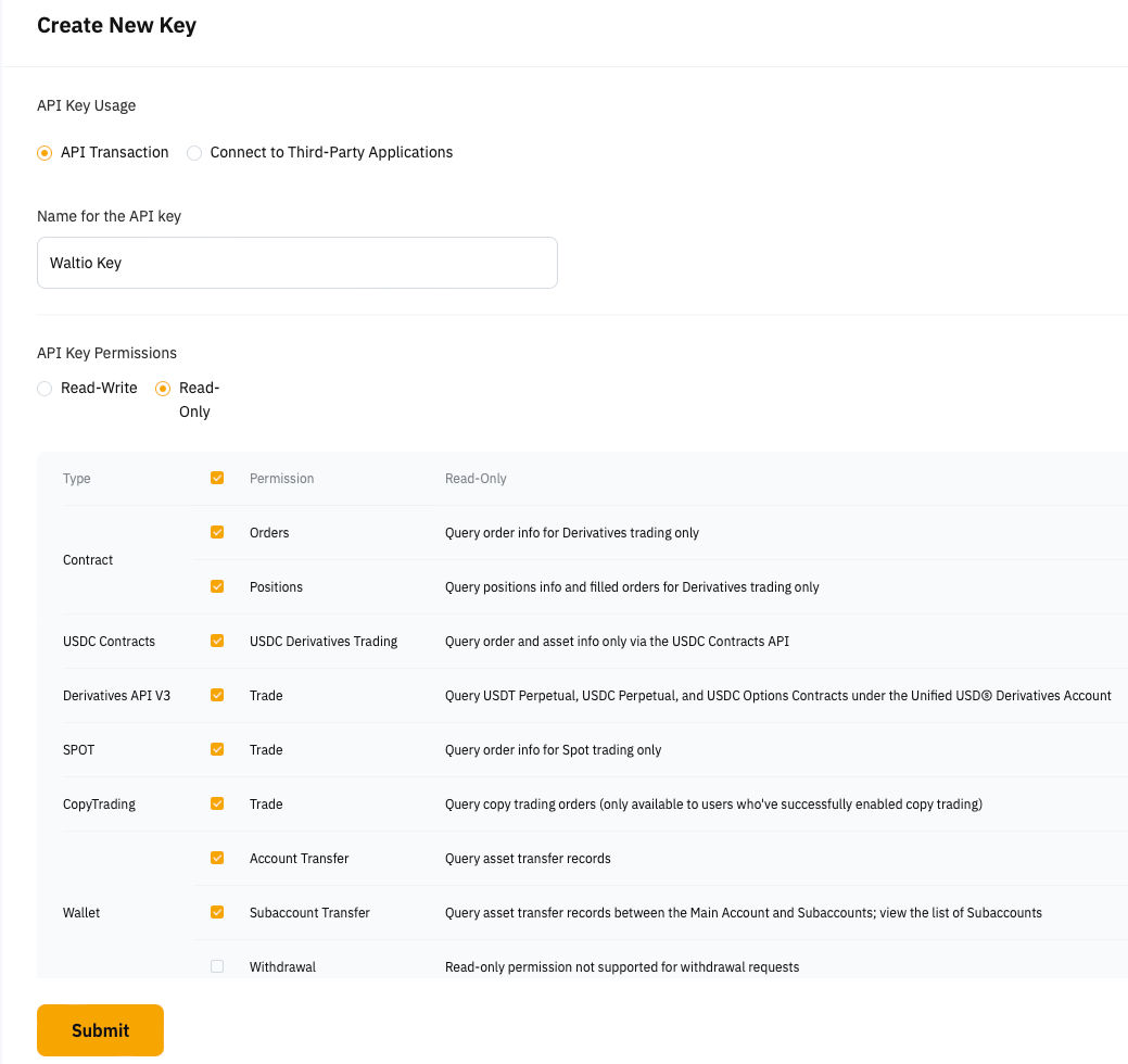 - Sélectionnez toujours la permission Lecture seule lors de la création de la clé API.