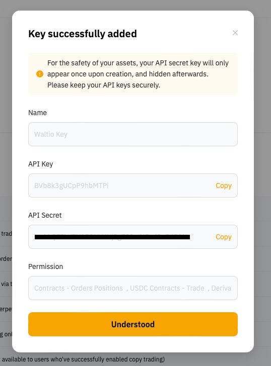 - Sauvegardez immédiatement votre clé API et votre clé secrète après leur création.