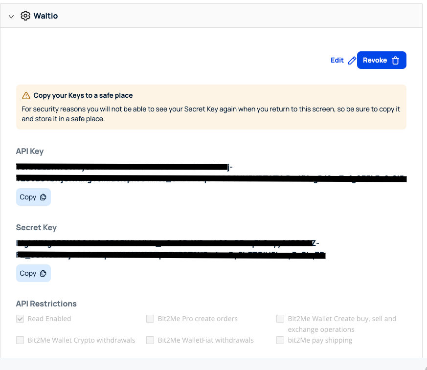- Nomini la Sua chiave API in modo chiaro (ad esempio, WaltioKey) per una più facile identificazione.